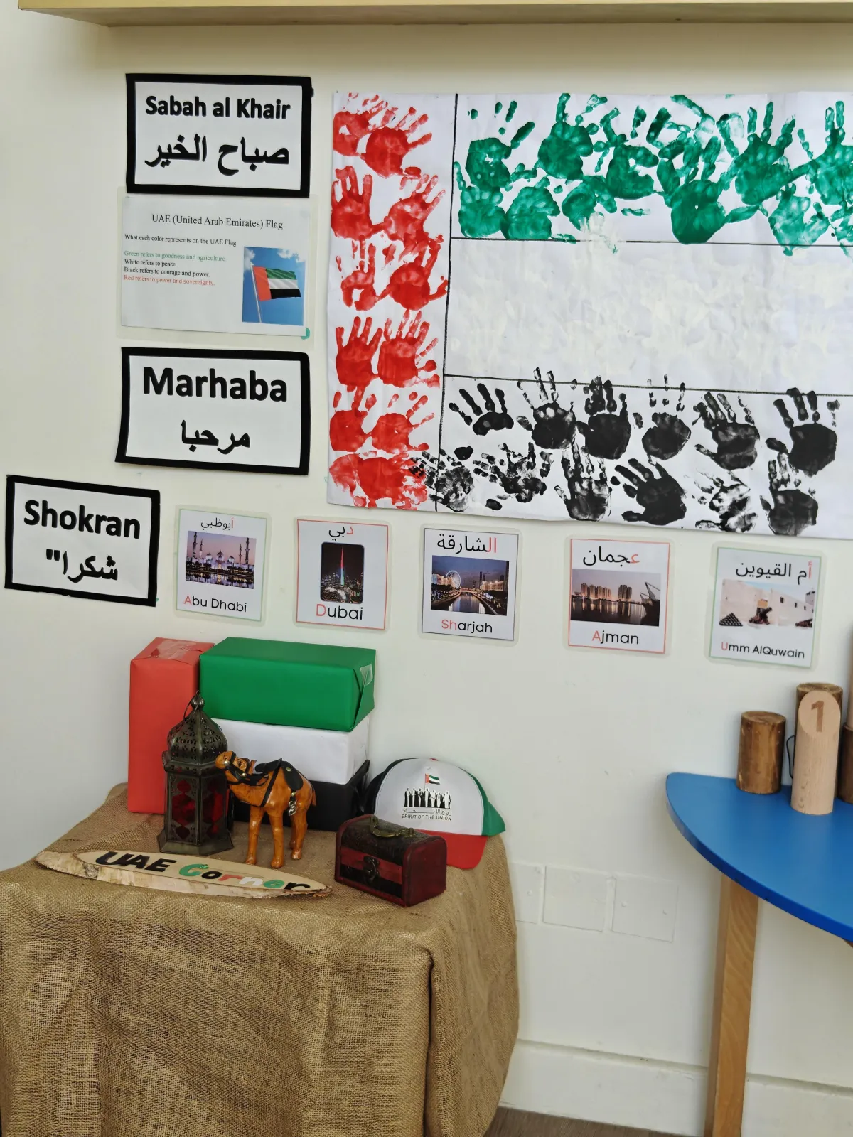 Age-appropriate classrooms, a UAE Heritage Room, a sensory exploration room, a Reggio-inspired room, and a fully equipped indoor gym.